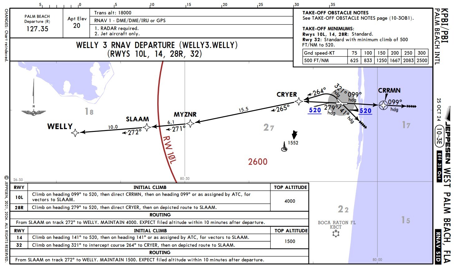 For example, using the same departure procedure we have been discussing, but now departing West Palm Beach on Runway 14, pilot instructions are to “climb on heading 141° to 520’, then remain on heading 141°, or as assigned by ATC for subsequent vectors to SLAAM”.