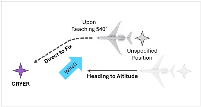 Continuing with the departure procedure for Runway 28R, after *ALT the procedure designer wants the aircraft to proceed directly to CRYER. Because the previous Path Terminator did not have a specified geographic location where it would terminate, due to variable aircraft climb performance, the navigation data must now command a new calculation to steer the aircraft to the desired waypoint. This will be accomplished by the FMS using a “DF” or Direct to a Fix path terminator.