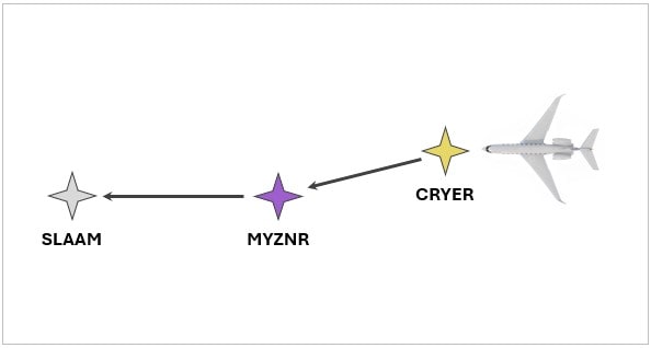Subsequent remaining legs on the same departure procedure are more straight-forward, using Track to a Fix to connect waypoints such as CRYER, MYZNR, SLAAM, and WELLY. The Track to a Fix or “TF” path terminator (Figure 6) simply tells the FMS to connect one fix to the next by using a great circle route. It is the simplest of path terminators and is very commonly used to link fly-by waypoints together, particularly enroute. For example, airway construction is typically straightforward as it simply links waypoints together to create a defined route using “TF” (track to a fix) legs. Procedure designers can position waypoints using latitude/longitude and use “TF” path terminators thus allowing the FMS to connect them together.