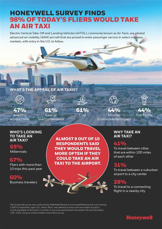 PHOENIX, March 4, 2025 -- Honeywell (NASDAQ: HON) today released new survey results showing nearly all U.S. airline fliers (98%) would consider taking an electric vertical take-off and landing vehicle, or eVTOL, as part of their travel journey. Commonly referred to as air taxis, these piloted advanced air mobility (AAM) aircraft are poised to enter passenger service in select overseas locations and then will take flight in the U.S. The survey of 1,000 U.S. adult fliers also found that almost 8 out of 10 respondents would travel more often if they could take an air taxi to the airport (79%).