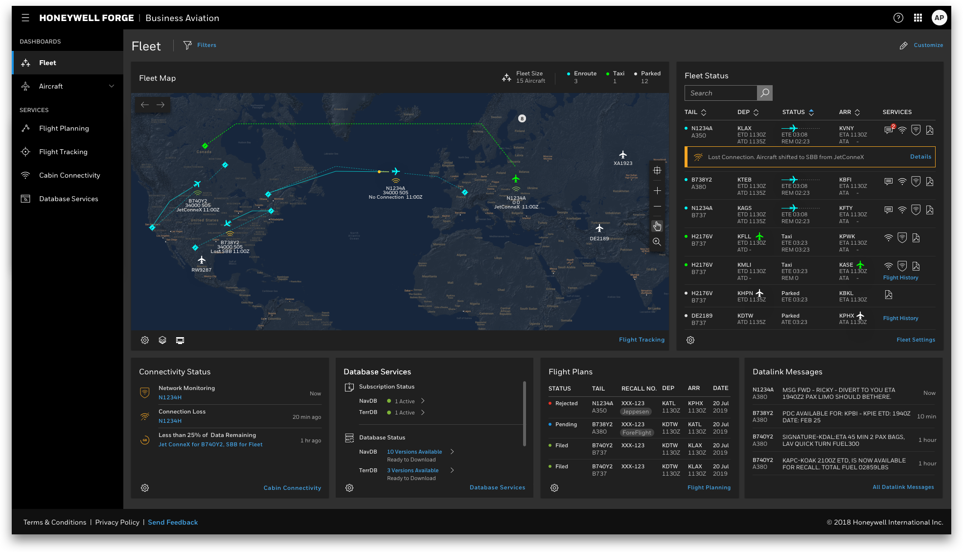 We built Honeywell Forge to make observing services with Honeywell easier. Honeywell Forge is a central place to get continuing view of your fleet's connectivity, flight plans, datalink messages, and database updates. More integration with managing services will be rolled out on a regular basis.