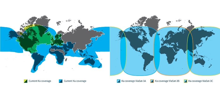 ViaSat Ka-Band provides high-speed broadband coverage using the ViaSat-3 satellite constellation. Viasat now provides service without speed limits. Typical speeds greater than 20 Mbps range and committed speeds of 8 Mbps. ViaSat gives business jet passengers a true “office in the sky” user experience, including the ability to stream live video within the current coverage area.