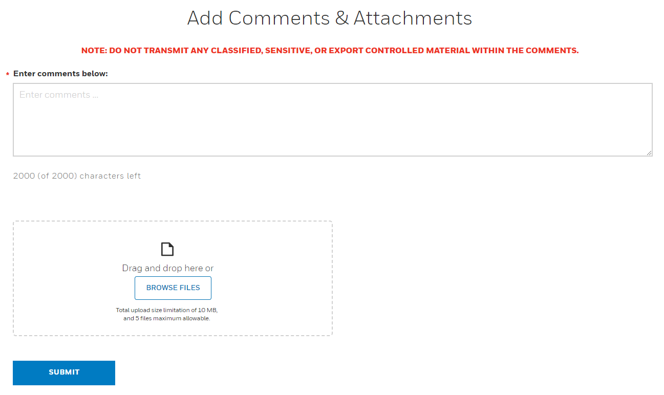 To leave a comment on a specific case, select View for the case of interest from the Case Management page. After selecting View, you'll be directed to the Case Detail page. Here, navigate halfway down to find a section labeled Add Comments & Attachments. While adding a comment is mandatory, attaching files is optional. Remember to hit the blue SUBMIT button after entering your comment and attaching any files.